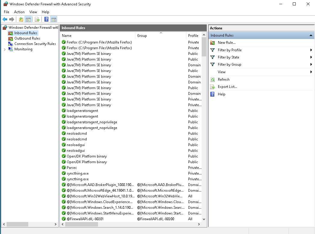Next you will want to follow these steps for all ports. Start by clicking on the Inbound Rules item. Click on the New Rule item from the Actions tab on the right of the window