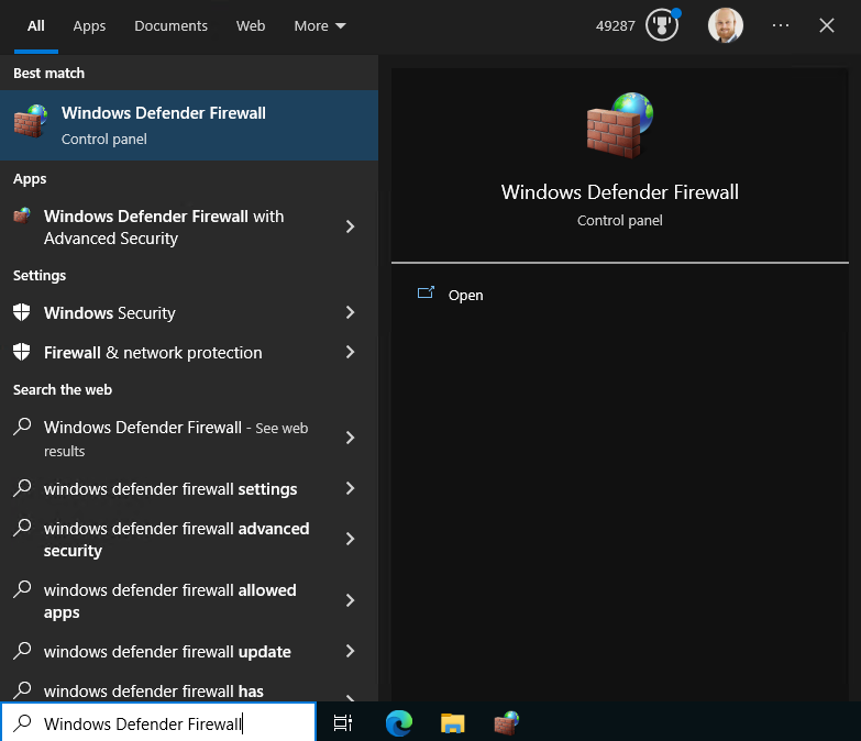 Search For the Windws Defender Firewall and select it from the menu