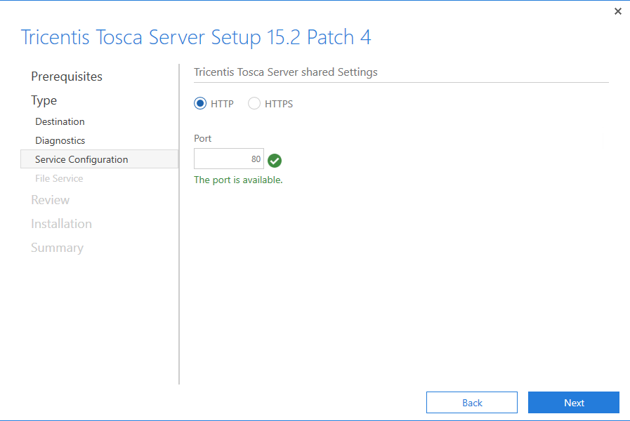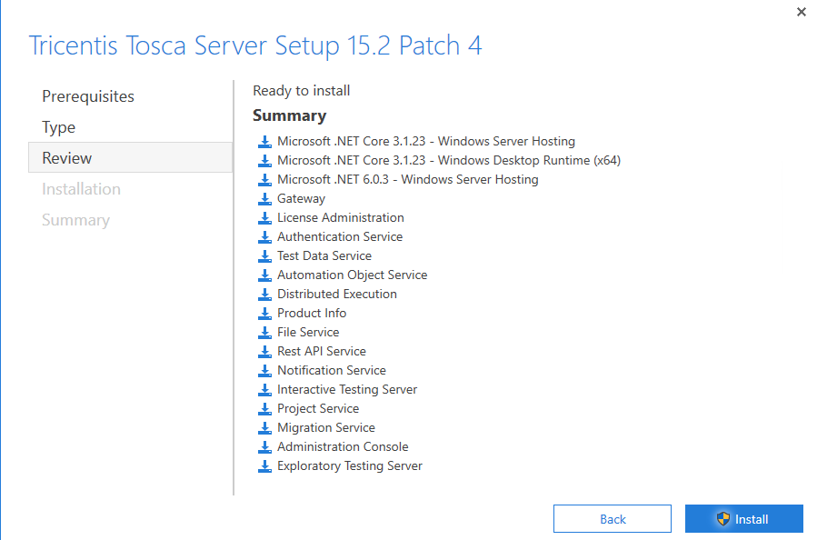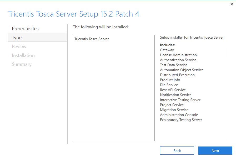 After the pre-requisites you will see a list of items that will be installed. Here we see Tosca Server, as that is the only item being installed by this instller. Click the next button to proceed