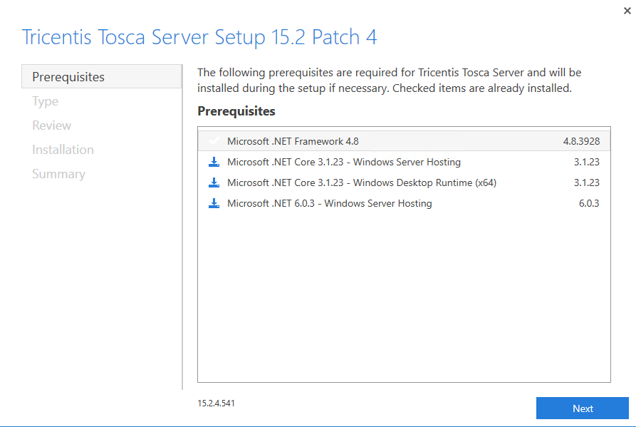 Next you will see a list of pre-requisites needed for the machine to work with Tosca Server. To accept these and continue click the next button